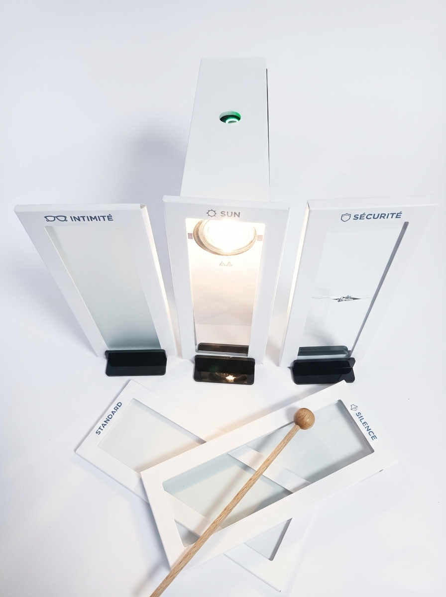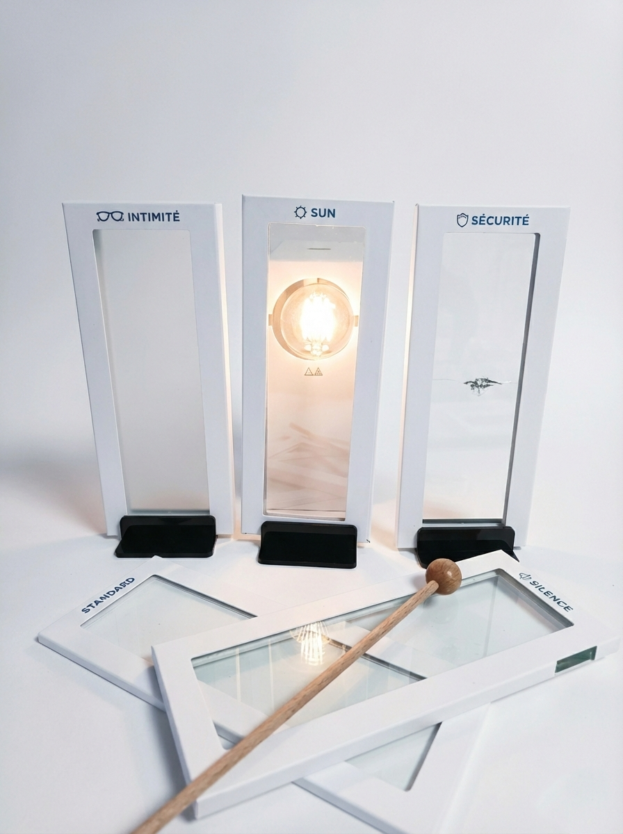 La ConfortBox est un démonstrateur sensoriel innovant conçu par Saint-Gobain pour permettre aux clients de vivre l’expérience du confort apporté par nos vitrages. Elle met en avant 4 types de verres aux bénéfices distincts :