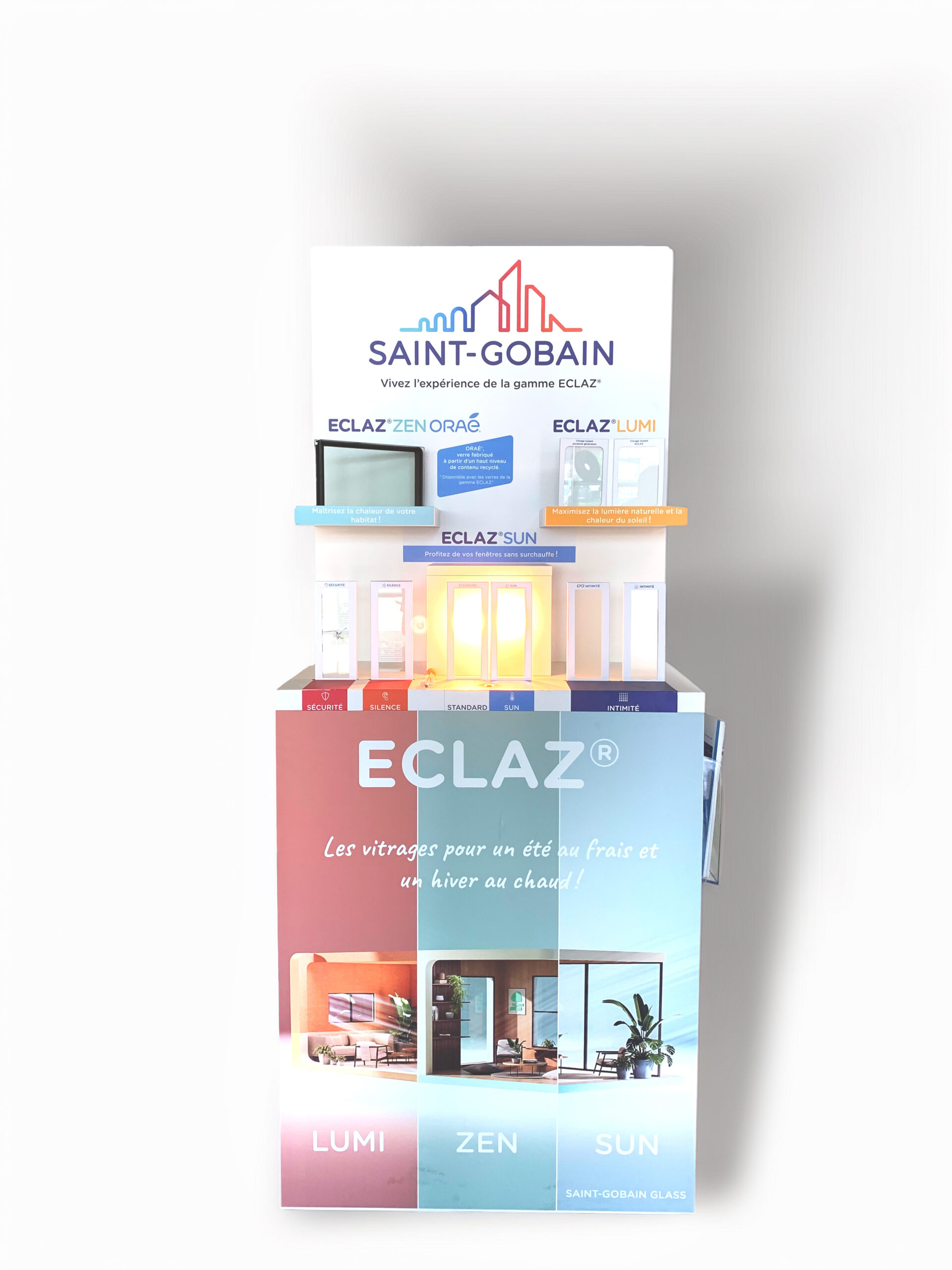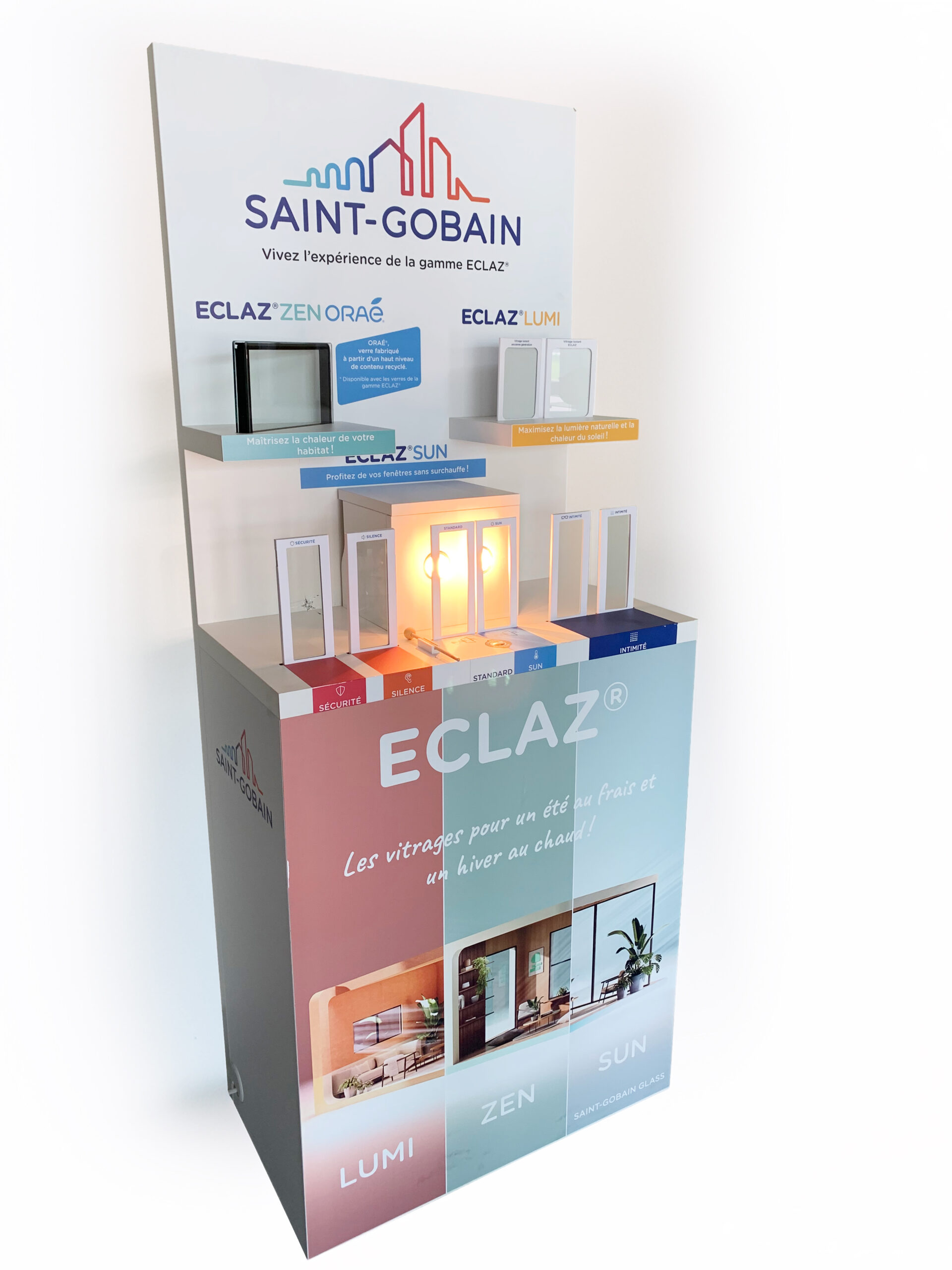 Démonstration intuitive et comparative : Le meuble Corner offre une visualisation immédiate des performances des vitrages (transparence, isolation, confort).Il favorise la compréhension des choix possibles dans les menuiseries.